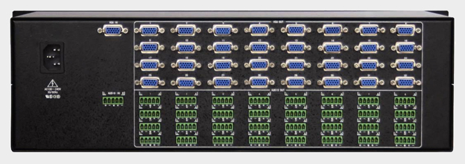 - 金灿VGA加音频系列1进32出分配器采用高性能专业的音頻,视频处理芯片,视频标准75Ω阻抗,音频标准600Ω;VGA输入输出均采用VGA母头;音频输入输出统一凤凰端子连接器;视频能够显示高清分辨率1920×1080P,传输中能够起到简单的分配放大作用,作用是将某一路视音频信号无衰减分配到多台显示设备和音频功率放大器上(音频功率放大器再连接到音箱或喇叭上),显示设备显示图像,喇叭播放声音;目前工厂标准产品从1TO4至1TO32;其它非标准产品可来电定做加工。